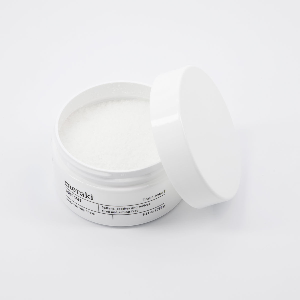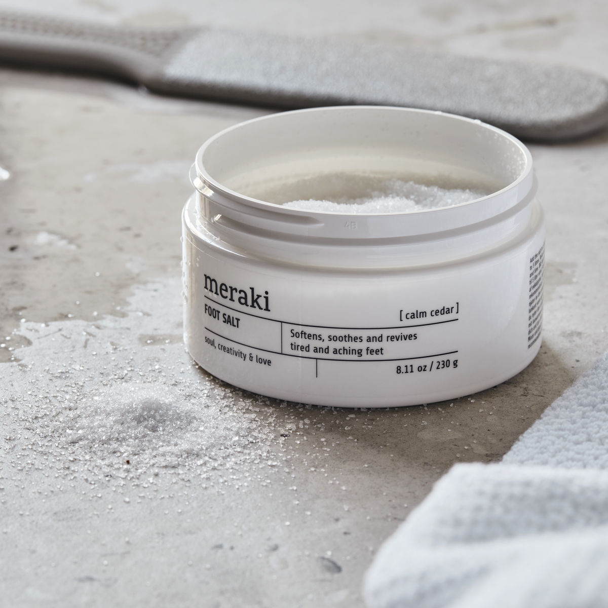 Återuppliv trötta och värkande fötter med detta fotsalt från Meraki. Saltet heter Calm Cedar och är ett havssalt som mjukar upp, lugnar och återupplivar dina fötter efter en lång dag. Koppla av och ta en välförtjänt paus med ett fotbad medan du njuter av den energigivande doften av eukalyptus, mynta och lime. Tillsätt bara saltet i ett fotbad fyllt med ljummet vatten och blanda. Vi rekommenderar 2-3 matskedar i 5 liter. Att blötlägga fötterna är ett enkelt sätt att skämma bort dig själv efter en dags hårt arbete eller när du bara vill njuta av en avkopplande stund. Certifierat av ECOCERT Natural.
