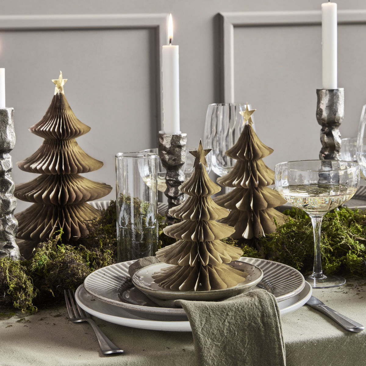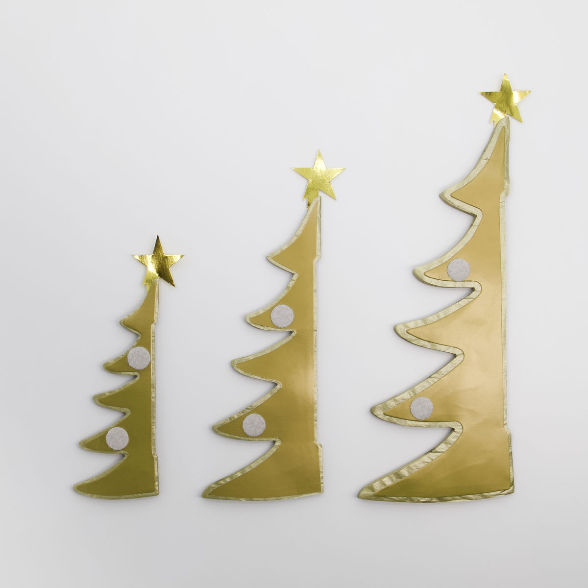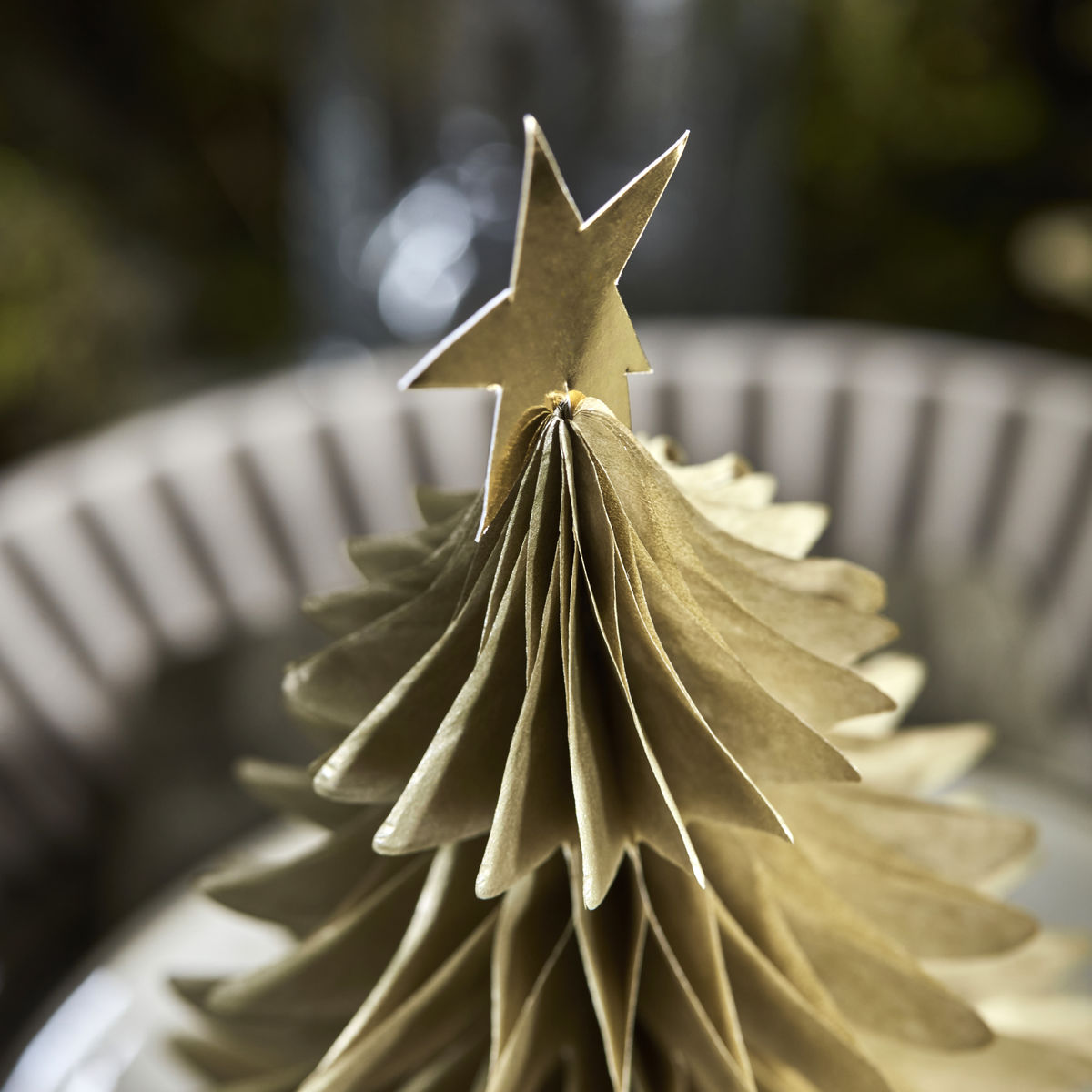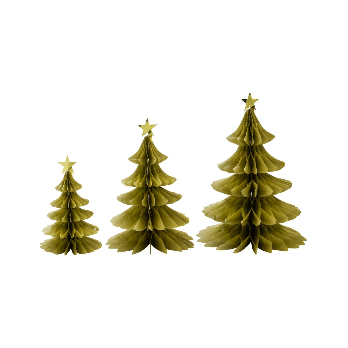 Handgjorda julgranar i papper som ger en gyllene glans till ditt julpynt. Perfekta för bordsdekorationer, fönsterbrädan eller hyllan.– Handgjorda för unik charm– Gyllene färg för festlig glans– Lätta att montera– Set med tre storlekarGe din juldekoration ett glittrande inslag!