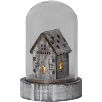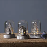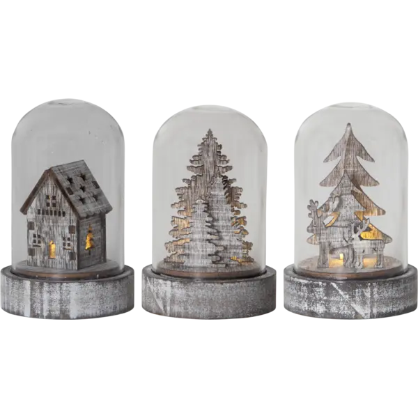 Set med 3 små kupoler med trädekoration inuti. Batteridriven med LED-belysning. Fin att dekorera med och den har ett varmvitt sken.