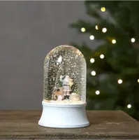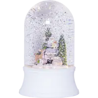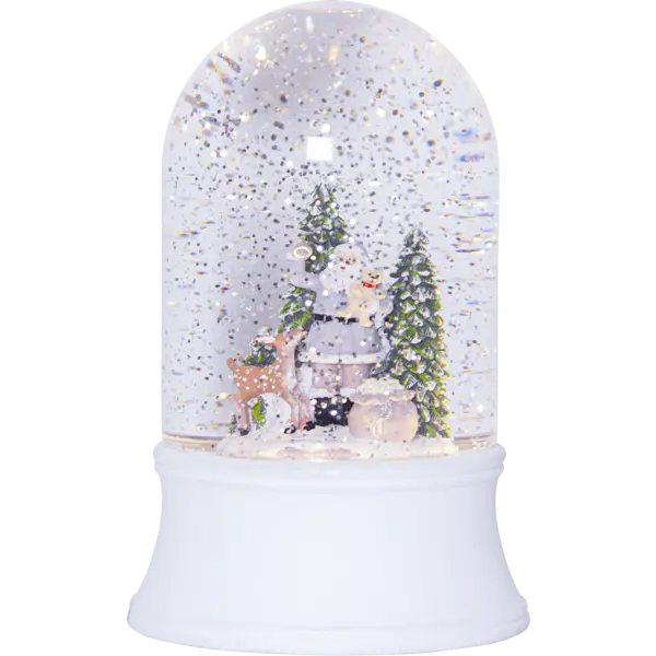 Stämningsfull glittrande, vattenfylld kupol med en jultomte, granar och en liten hjort. Glitter vätskan är i rörelse när produkten är påslagen, lyser fint. Placera på ett bord eller en hylla för en härlig julstämning.