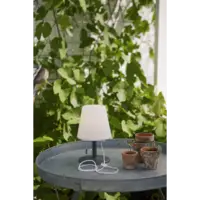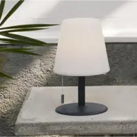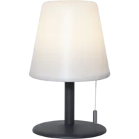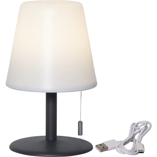 Snygg portabel bordslampa med varmvitt ljussken, vilket du kan justera, svagt eller starkt ljus, genom att dra i det hängande snöret. Uppladdningsbart batteri som laddas med medföljande USB kabel. För både inom- och utomhusbruk. Ger behaglig extrabelysning ljumma sommarkvällar i trädgården eller på balkongen. När batteriet är fulladdat kan lampan lysa upp till 6-7 timmar.
