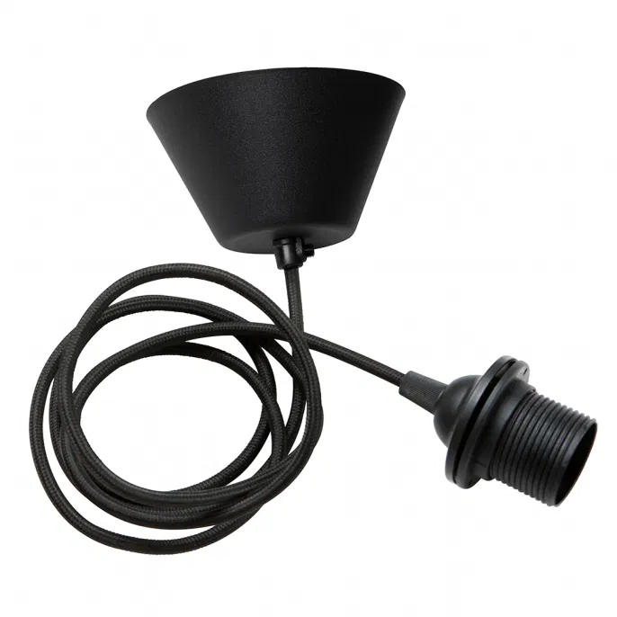 Takupphäng med stilfull, svart textilkabel, för E27-ljuskällor. Passar som upphäng till taklampor och lampskärmar med E27-ringfäste, avsedda att kunna användas som taklampa.Material Textil/plast Material sladd Textil Färg sladd Svart Längd sladd cm 185 cm Sockel E27 Max watt 60 Takkopp färg Svart Takkopp material Plast Energiklass A++ -E Höjd cm 8 Diametern cm 13
