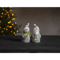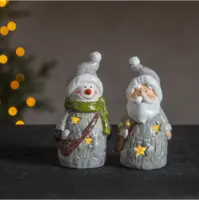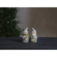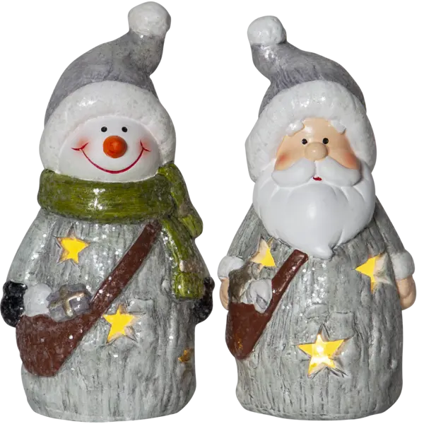 Dekorativ tomte och snögubbe, i grå gröna toner. Båda glittrar lite i färgen för en frostad känsla. Lyser fint i warm vit färg. Placera på ett bord eller på en hylla och få en härlig julkänsla.