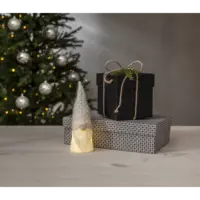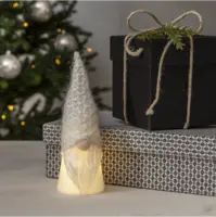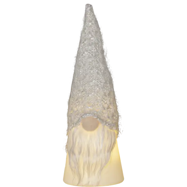 Batteridriven dekorationsfigur med LED-belysning. Tomten har en vit textil luva och det lyser fint i kroppen på dekorationen är på. En härlig dekoration som sprider julstämning i hemmet.