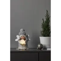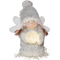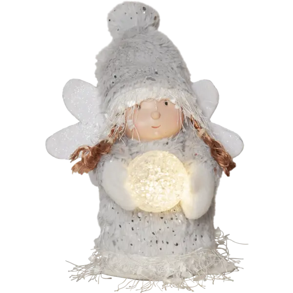 Mysig grå ängel som har en snöboll i sina händer, det lyser i snöbollen när produkten är på. Dekorera med till jul och advent. Drivs med batterier.