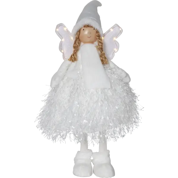 Dekorativ ängel för dekoration med lysande dew drops i vingarna. Den söta ängeln har vita kläder med vit halsduk. Produkten drivs av 2st CR2032-batterier, dessa ingår.