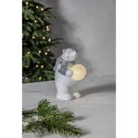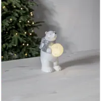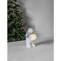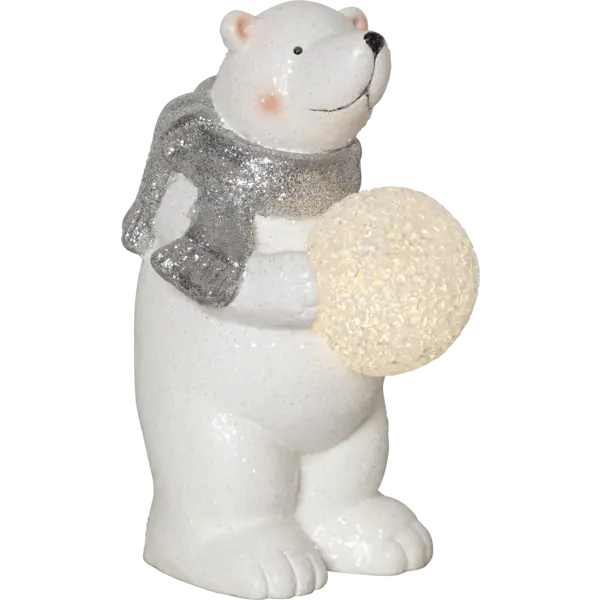 Dekorativ isbjörn med en snöboll ifamen, det lyser fint i snöbollen. Isbjörnen är vit med frostig känsla. Produkten har timer funktion och drivs av 2st AG13/LR44 batterier som ingår. Härlig dekoration till vintern och jul. Dekorera barnrummet eller placera den på ett bord eller hylla för bästa advent och julstämingen.