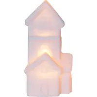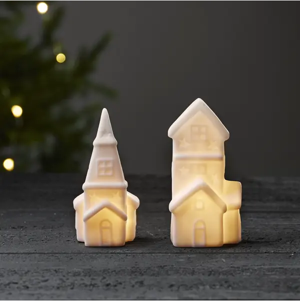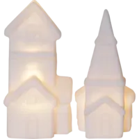 Vackra dekorationsfigurer formade som en kyrka och ett hus. Figurerna är batteridrivna och ger ett fint sken. Fin juldekoration som skapar stämning i rummet.