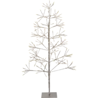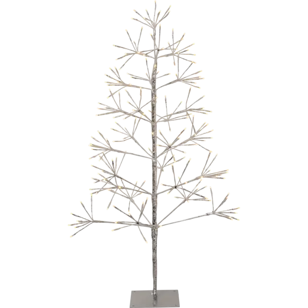 Silverfärgat dekorationsträd för utomhusbruk. Perfekt dekoration för att skapa en härlig stämning i trädgården eller på uteplatsen. Trädet är 120cm högt med 200 LED-ljuskällor som ger ifrån sig ett fint varmvitt sken.