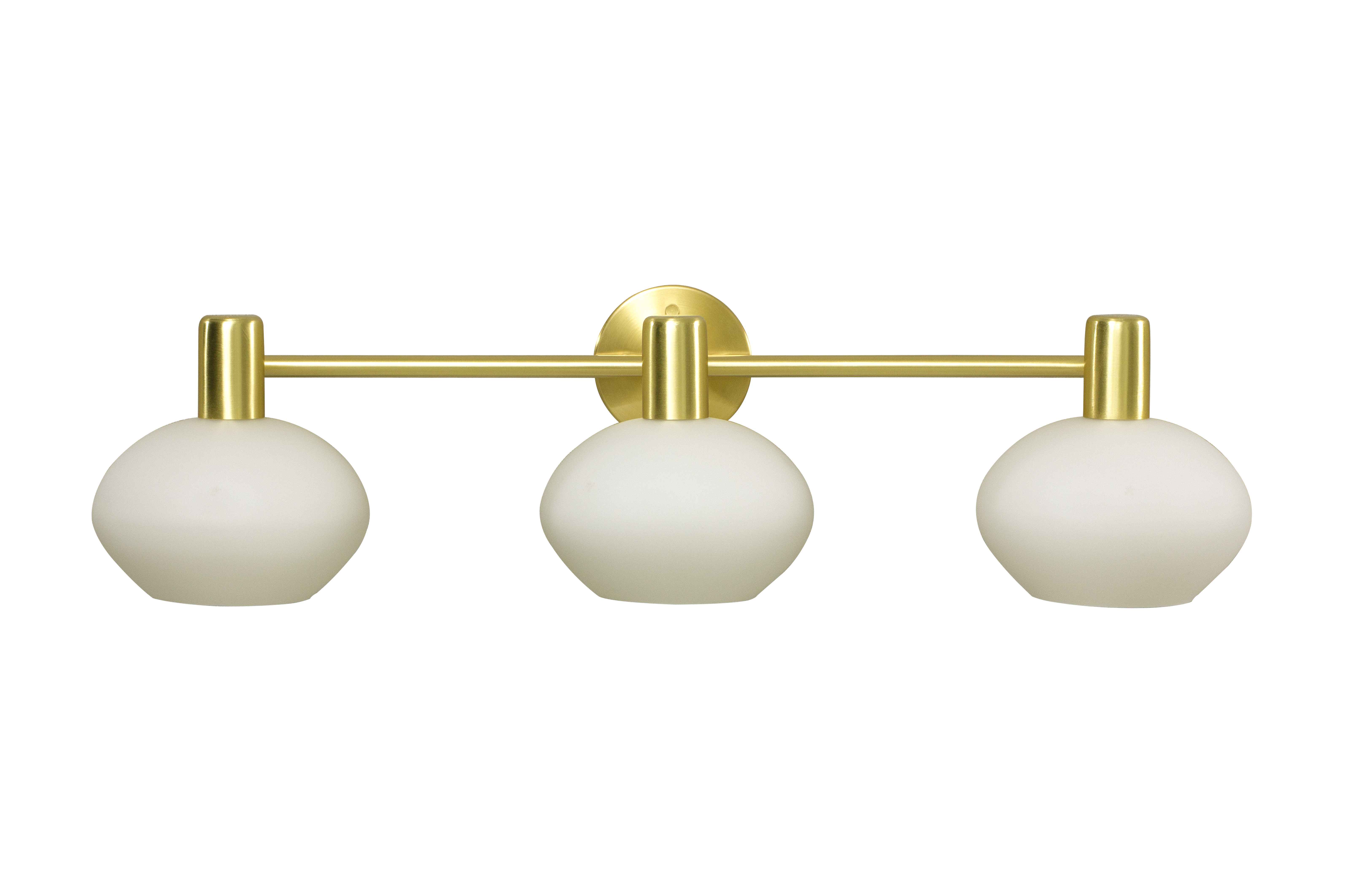 Lampan är tillverkad av högkvalitativt material och har en vacker matt mässingfinish som ger den en modern och exklusiv känsla. Den har tre ljuskällor som sprider ett jämnt och behagligt ljus över hela rummet. Ljuskällorna är placerade på en rektangulär platta som fästs på väggen, vilket ger en stilren och minimalistisk look.