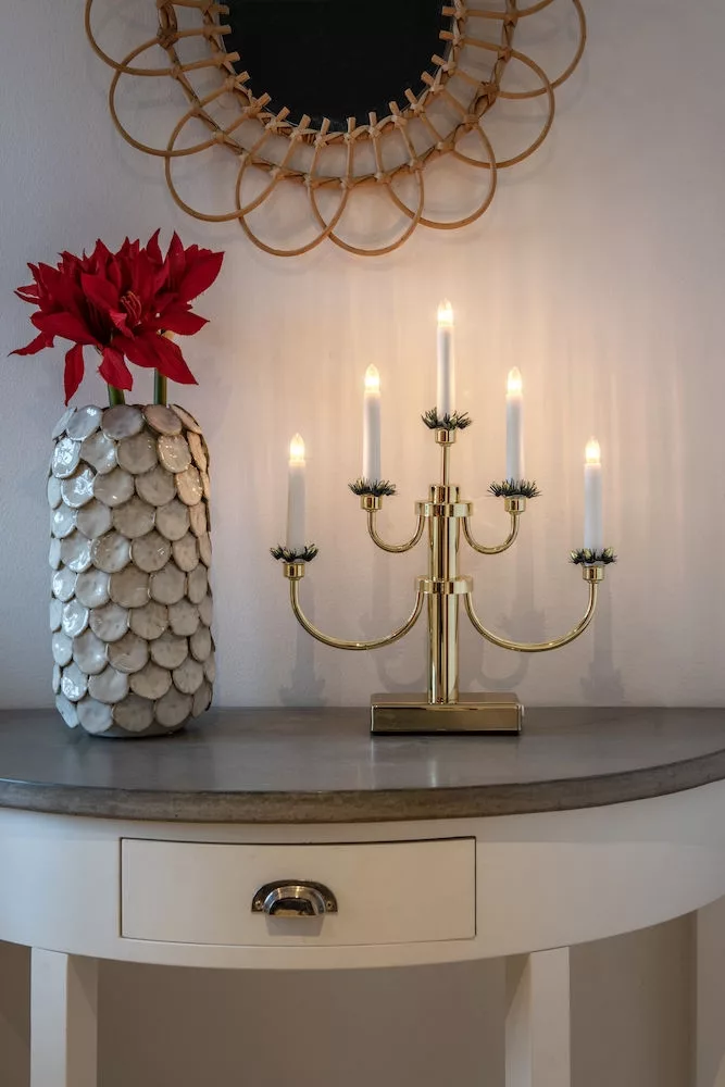 Ljusstaken har plats för fem ljus, vilket ger ett vackert och jämnt ljus när de är tända. Du kan använda vanliga ljus eller LED-ljus i ljusstaken, beroende på dina preferenser. Den är utrustad med en strömbrytare som gör det enkelt att tända och släcka ljusen.