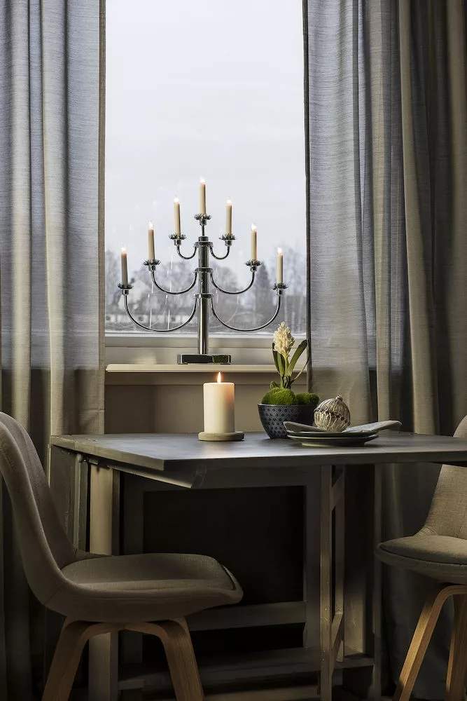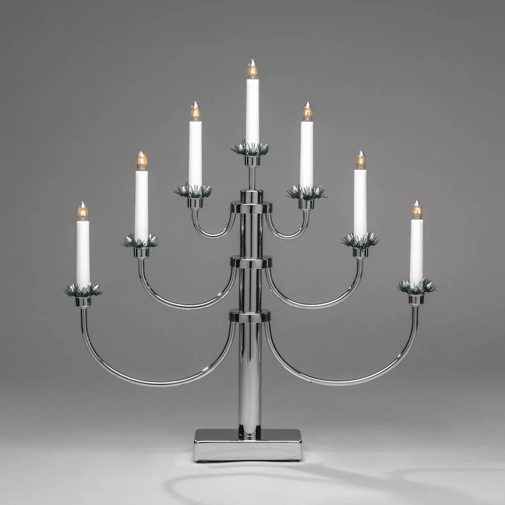 Elljusstaken har en stilren och tidlös design som passar perfekt i alla typer av inredningsstilar. Den kan placeras på en fönsterbräda, en hylla eller mitt på ett bord för att skapa en vacker och festlig dekoration. Med sin kromfinish ger den också en touch av elegans till rummet.