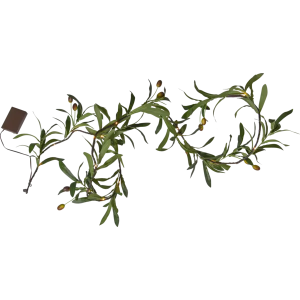 Dekorativ 180 cm lång formbar girlang med olivblad och oliver. Ger ett behagligt sken och passar som dekoration både inom- och utomhus. Batteribox med timerfunktion och för utomhusbruk.