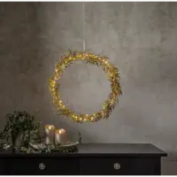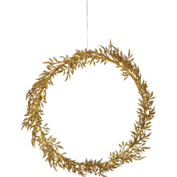 Lyxig julkrans att hänga mot en väggen eller i fönster. Kransen har guldglittriga löv somger ett fylligt och glamoröst intryck. 50 små led punkter lyser stämningsfullt i kransen. Dekorera till jul eller vid andra festliga tillfällen.