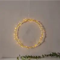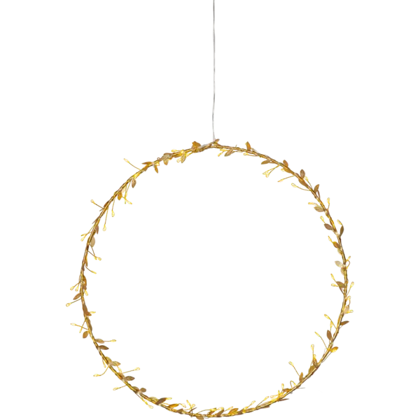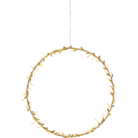 Stämningsfull guldkrans 38cm, guld löv i polyester. 80 små led punkter lyser fint i kransen. Dekorerar till jul och advent eller varför inte så fort den mörka årstiden börjar. Häng dekoratioen i ettfönster, mot en dörreller vägg. Produkten är batteridriven med timer funktion.
