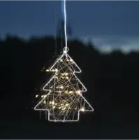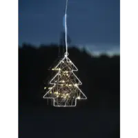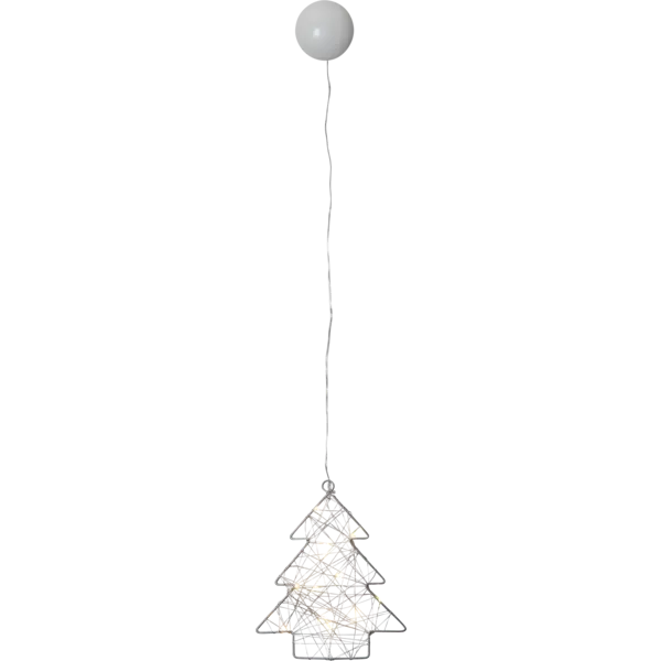 Batteridriven hängande metallgran. Fin dekoration att inreda med i hemmet. Granen har 12 LED-ljuskällor med varmvitt sken. Med sugkopp för lätt montering på fönster eller spegel.