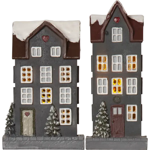 Ett set med två hus. Båda husen lyser fint, drivs av batteri och har timer funktion. Dekorera en hylla eller placera dom på en skänk. Passar utmärk hela den mörka årsstidenoch blir en stämningsull dekoration till advent och jul.