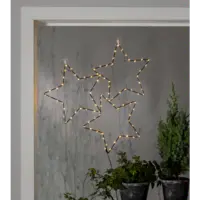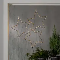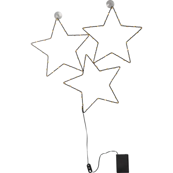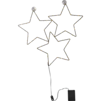 Den perfekta fönsterdekorationen i form av 3 stjärnor som hänger ihop. Fäst dekorationen med medföljande sugkoppar. Små LED-ljuskällor lyser fint när produkten är på. Drivs av batteri och har timer funktion. Härlig dekoration för den mörka årstiden, jul och advent.