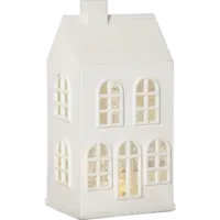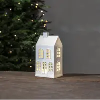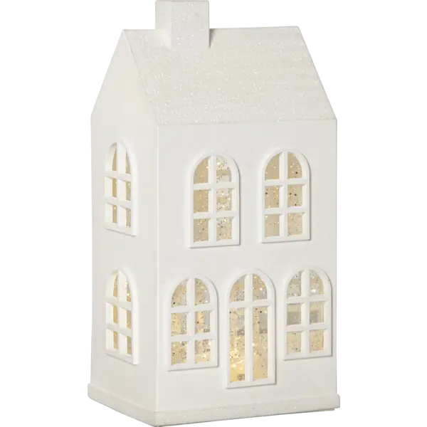 Fantastiskt vitt huslykta som juldekoration. Glittrande vitt tak och fina fönster. Det snöar och lyser vackert när produkten är påslagen. Batteri driven med timer funktion. Placera på ett bord eller en hylla för en härlig advents och julstämning.