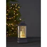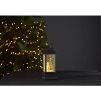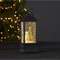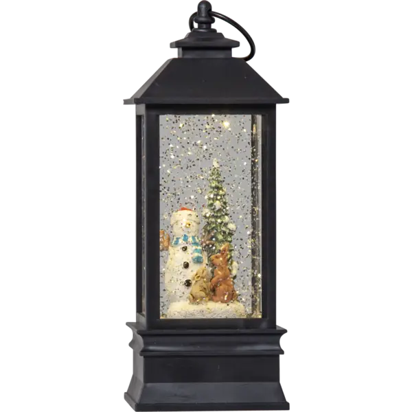 Glittrande vattenfylld svart lykta med snögubbe inuti. Glitter vätskan är i rörelse när produkten är påslagen, lyser fint. Placera på ett bord eller en hylla för en härligjulstämmning.
