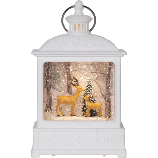 Glittrande, vattenfylld lykta med två hjort. Vacker bakgrunds. Glitter vätskan är i rörelse när produkten är påslagen, lyser fint. Placera på ett bord eller en hylla för en härlig julstämning.