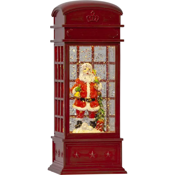 Glittrande vattenfylld telefonkiosk med jultomte inuti. Glitter vätskan är i rörelse när produkten är påslagen, lyser fint. Placera på ett bord eller en hylla för en härligjulstämmning.