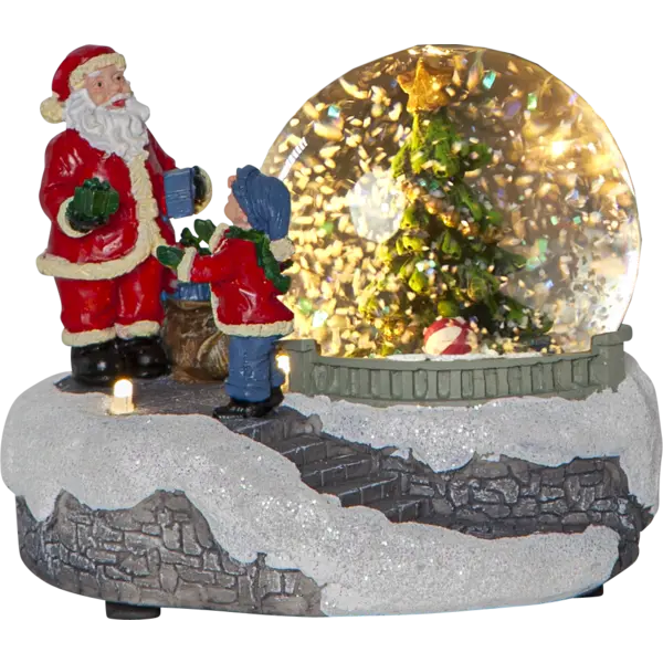 Snöglob av glas. I globen finns en gran. Utanför står tomten och pratar med tomtenissen. Skaka globen och snön faller vackert. Små led lampor lyser upp dekorationen. Drivs med batterier. Placera i en hylla eller på en bänk för att få en härlig julstämning.