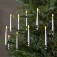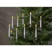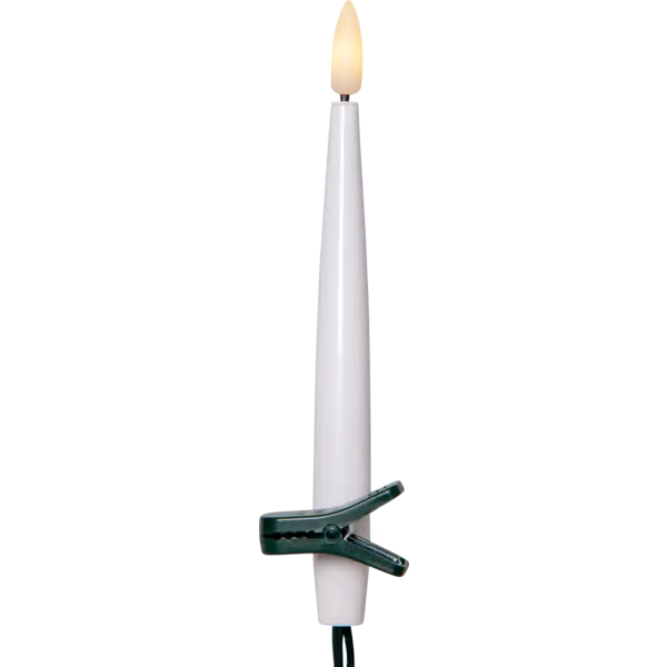 Batteridriven julgransbelysning med populära Flammelågan. 16 vita lite högre smala ljus med flammande låga. Varje ljus är försedd med avtagbart clips för att lätt kunna fästas i granen. Grön kabel och batteridosa för inomhusbruk. Batteridosan är försedd med timerfunktion.