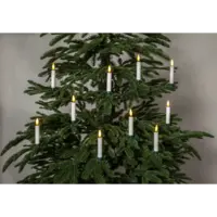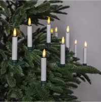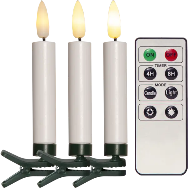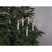 Trådlös julgransbelysning med 10 LED-lampor för inomhusbruk. Ljusen med 3D låga ser verklighetstrogna ut och har ett vackert ljussken, ljusen är vita med gröna clips. Den inbyggda timern och medföljande fjärrkontroll gör det lätt att ställa in när ljusen ska lysa.