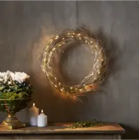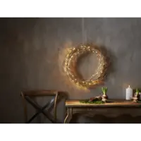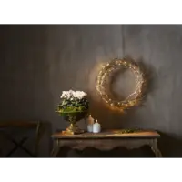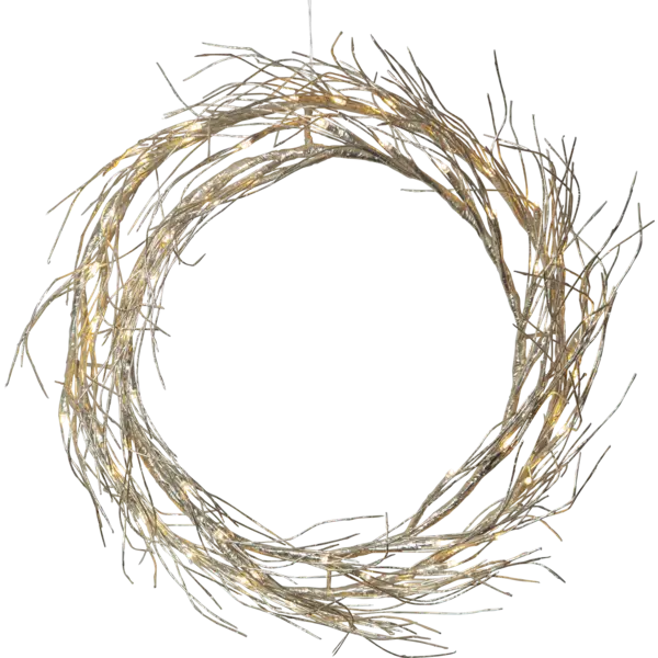 Fantastisk krans att hänga mot en väggen eller i fönster. Kransen svagt guld färgad och dubbel för att ge ett fylligt och glamoröst intryck. 50 små led punkter som lyser stämningsfullt i kransen. Dekorera till jul eller andra festliga tillfällen.