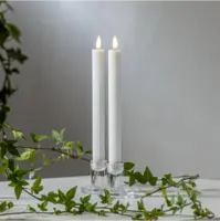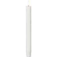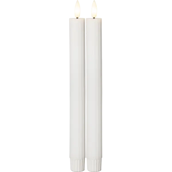 2 pack vita antikljus i vår Flamme Stripe serie, gjorda i vax i med en räfflad-randig yta. Ljusen har en mycket naturtrogen låga som lyser med varmvitt sken. De har timerfunktion vilket gör att ljusen lyser i 6h per dag i ca 30 dagar. De drivs av 2 AAA batteri för varje ljus, dessa ingår ej.