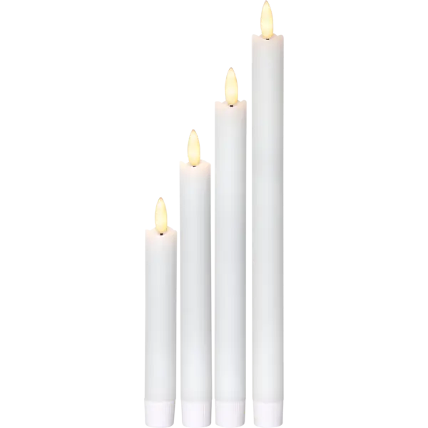 Ett set med våra fina Flammeljus som är tillverkade i äkta vax. 4 olika höjder, från 28cm ner till 16cm. Samtliga drivs av AAA batteri och har inbyggd timer. är tillverkade av riktigt vax. Undvik att ställa dem i direkt solljus då de kan smälta av värmen.