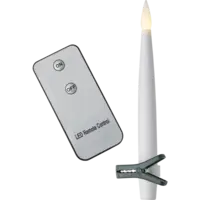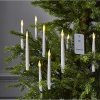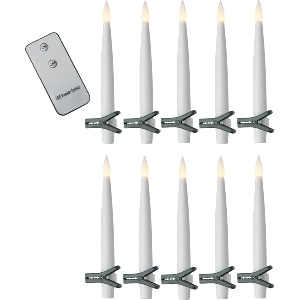Trådlös julgransbelysning med 10 vita granljus för inomhusbruk. Ljusen ser verklighetstrogna ut och ger ett fint varmvitt sken. Det medföljer gröna hållare och fjärrkontroll.