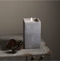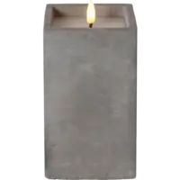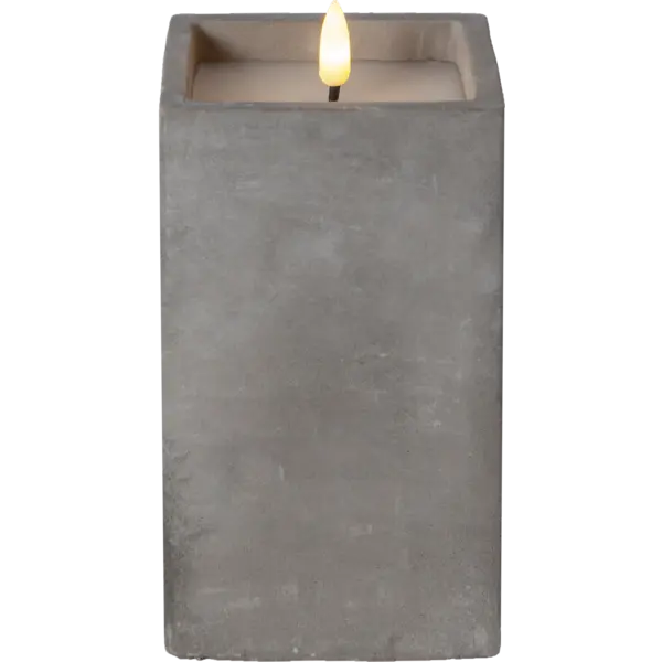 Flamme Cem är ett fyrkantigt ljus med ytterdelen gjord av cement och innerdel av vax. Ljuset är cirka 8,5x15cm för cement delen och 16,5cm inklusive lågan. Detta elektriska ljus blir en vacker dekoration, både ensam och i grupp ihop med övriga ljus från vår Flamme serie. Den har timerfunktion och när brytaren är på timerläget lyser ljuset i ca 30 dagar med en vacker realistisk låga i varmvitt. Den drivs av 2 AA batterier, dessa ingår ej.
