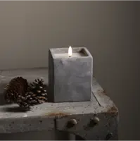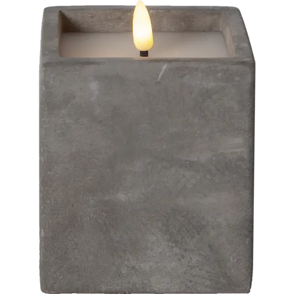 Flamme Cem är ett fyrkantigt ljus med ytterdelen gjord av cement och innerdel av vax. Ljuset är cirka 8,5x10cm för cement delen och 11,5cm inklusive lågan. Detta elektriska ljus blir en vacker dekoration, både ensam och i grupp ihop med övriga ljus från vår Flamme serie. Den har timerfunktion och när brytaren är på timerläget lyser ljuset i ca 30 dagar med en vacker realistisk låga i varmvitt. Den drivs av 2 AA batterier, dessa ingår ej.
