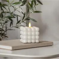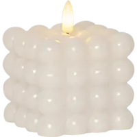 Flamme Dot är ett fyrkantigt ljus gjord av vit vax med en bubblig yta. Ljuset är cirka 8,5×9,5cm inklusive lågan. Detta elektriska ljus blir en vacker dekoration, både ensam och i grupp ihop med övriga ljus från vår Flamme serie. Den har timerfunktion och när brytaren är på timerläget lyser ljuset i ca 25 dagar med en vacker realistisk låga i varmvitt. Den drivs av 2 AAA batterier, dessa ingår ej.