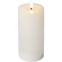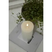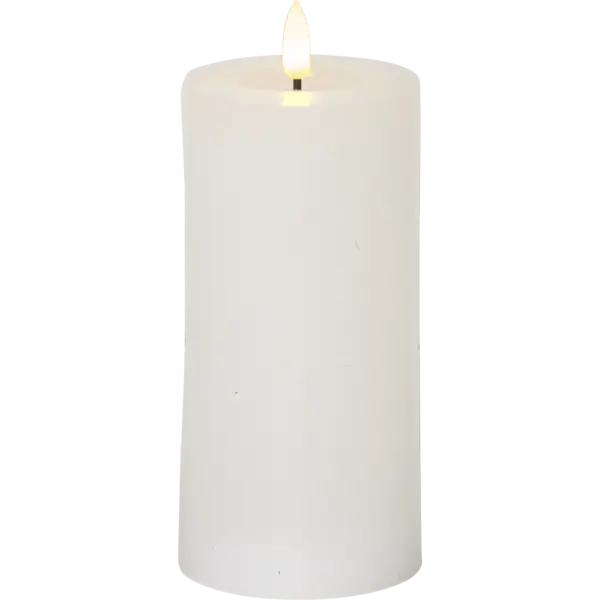 Flamme Flow är ett elektriskt blockljus med vår naturtrogna låga Flamme. Detta stearinljus har en blank nedsänkning under lågan, denna yta ser ut som flytande vax vilket gör ljuset än mer naturtroget. Ljuset är cirka 7,5cm i diameter och höjden 15cm för vax delen och cirka 17,5cm totalhöjd med lågan. Detta ledljus blir en vacker dekoration, både ensam och i grupp ihop med övriga ljus från vår Flamme serie. Den har timerfunktion och när brytaren är på timerläget lyser ljuset i ca 30 dagar med en vacker realistisk låga i varmvitt. Den drivs av 3 AAA batterier, dessa ingår ej.