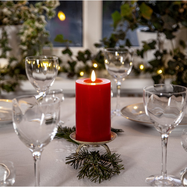 Flamme Flow är ett elektriskt blockljus med vår naturtrogna låga Flamme. Detta stearinljus har en blank nedsänkning under lågan, denna yta ser ut som flytande vax vilket gör ljuset än mer naturtroget. Ljuset är cirka 7,5cm i diameter och höjden 12cm för vax delen och cirka 15cm totalhöjd med lågan. Detta ledljus blir en vacker dekoration, både ensam och i grupp ihop med övriga ljus från vår Flamme serie. Den har timerfunktion och när brytaren är på timerläget lyser ljuset i ca 30 dagar med en vacker realistisk låga i varmvitt. Den drivs av 3 AAA batterier, dessa ingår ej.