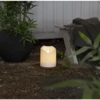 Utomhusljus i familjen Flamme. Gjord i plast. Lyser upp med varmvitt sken.