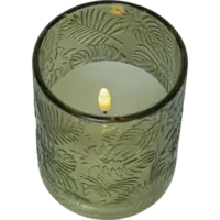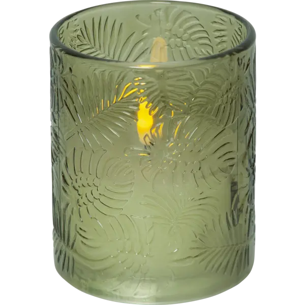 Flamme Leaf är gjord av grönt glas med lövmönster i relief runt ett vitt vaxljuset. Ljuset är cirka 10 x 12,5cm. Detta elektriska ljus blir en vacker dekoration, både ensam och i grupp ihop med övriga ljus från vår Flamme serie. Den har timerfunktion och när brytaren är på timerläget lyser ljuset i ca 30 dagar med en vacker realistisk låga i varmvitt. Den drivs av 2 AA batterier, dessa ingår ej.