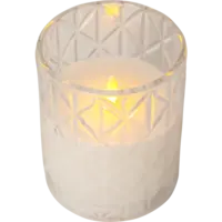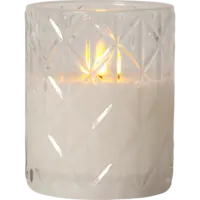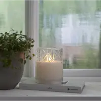 Flamme Romb har ett klart glas hölje med rombformat mönster runt vaxljuset. Ljuset är cirka 10 x 12,5cm. Detta elektriska ljus blir en vacker dekoration, både ensam och i grupp ihop med övriga ljus från vår Flamme serie. Den har timerfunktion och när brytaren är på timerläget lyser ljuset i ca 30 dagar med en vacker realistisk låga i varmvitt. Den drivs av 2 AA batterier, dessa ingår ej.