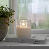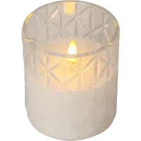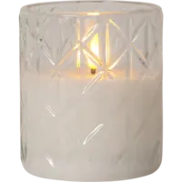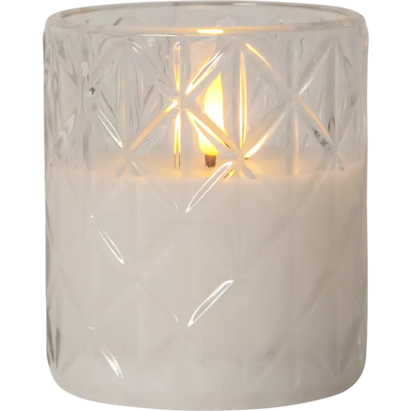 Flamme Romb har ett klart glas hölje med rombformat mönster runt vaxljuset. Ljuset är cirka 8 x 10cm. Detta elektriska ljus blir en vacker dekoration, både ensam och i grupp ihop med övriga ljus från vår Flamme serie. Den har timerfunktion och när brytaren är på timerläget lyser ljuset i ca 30 dagar med en vacker realistisk låga i varmvitt. Den drivs av 2 AA batterier, dessa ingår ej.