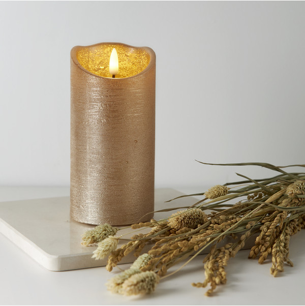 Guld ljus av vax med rustik yta i vår Flamme serie. Den naturtrogna lågan lyser med ett varmvitt sken. Med inbyggd timer.