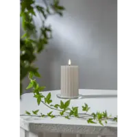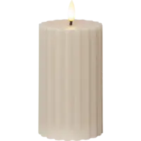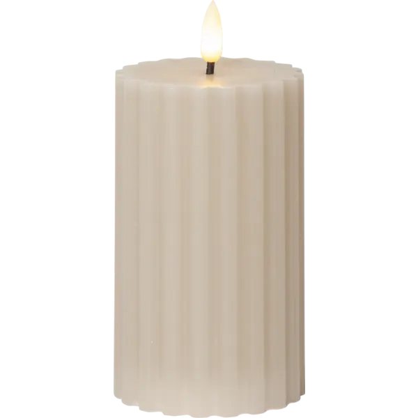 Flamme Stripe är ett blockljus gjord av beige vax med en räfflad-randig yta. Ljuset är cirka 8x15cm inklusive lågan. Detta elektriska ljus blir en vacker dekoration, både ensam och i grupp ihop med övriga ljus från vår Flamme serie. Den har timerfunktion och när brytaren är på timerläget lyser ljuset i ca 30 dagar med en vacker realistisk låga i varmvitt. Den drivs av 2 AA batterier, dessa ingår ej.