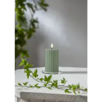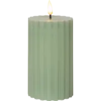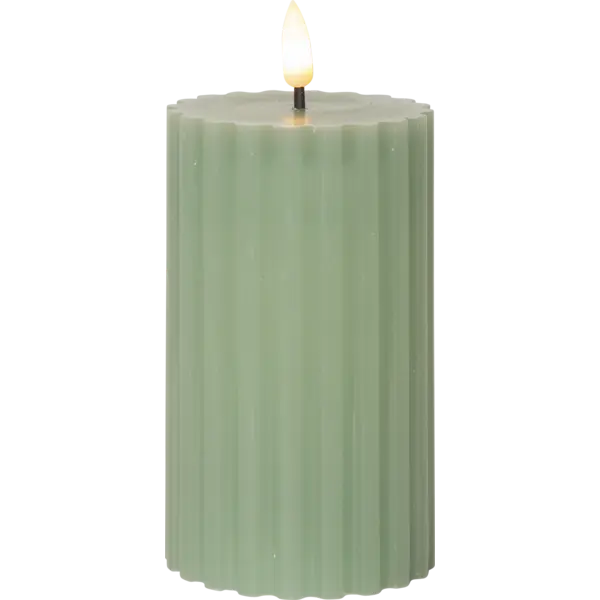 Flamme Stripe är ett blockljus gjord av grönt vax med en räfflad-randig yta. Ljuset är cirka 8x15cm inklusive lågan. Detta elektriska ljus blir en vacker dekoration, både ensam och i grupp ihop med övriga ljus från vår Flamme serie. Den har timerfunktion och när brytaren är på timerläget lyser ljuset i ca 30 dagar med en vacker realistisk låga i varmvitt. Den drivs av 2 AA batterier, dessa ingår ej.