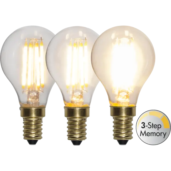 Klotformad ljuskälla med 3-stegs klickdimring som har minnesfunktion! Ljusstyrkan ändras enkelt genom slå av och på strömbrytaren. Välj mellan 40lm – 200lm – 400lm. Ljusfärgen är 2100K och sockeln är E14. Startar på senast använda ljusstyrkan.
