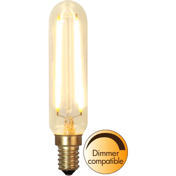 Tubformad ljuskälla med LED och E14-sockel. Färgtemperaturen är 2200K och den är dimmerkompatibel, så det är enkelt att få önskad ljusnivå.. Den har klart glas och passar i många armaturer och som tavelbelysning med sin höga färgåtergivning, RA90.
