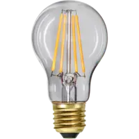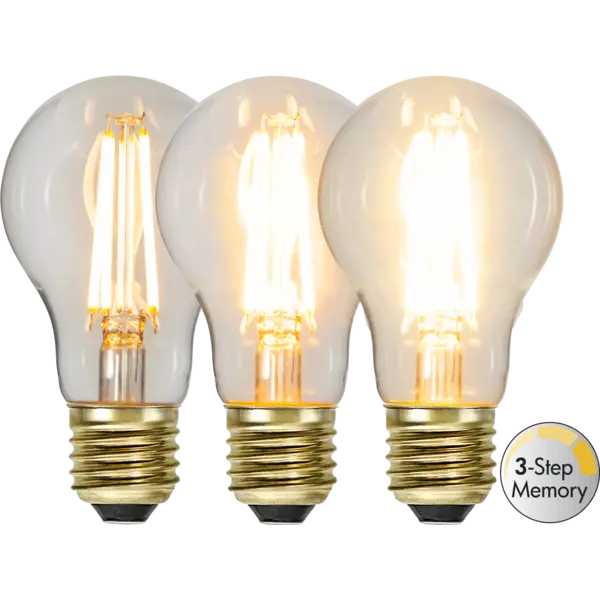 Normallampa med 3-stegs klickdimring med minnesfunktion! Ljusstyrkan ändras enkelt genom slå av och på strömbrytaren. Välj mellan 70lm – 350lm – 700lm. Ljusfärgen är 2100K och sockeln är E27. Startar på senast använda ljusstyrkan.