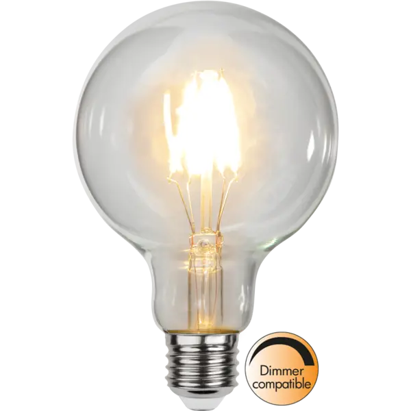 Globlampa med klart glas, LED och E27-sockel. Färgtemperaturen är 2700K.Lampan är dimbar.