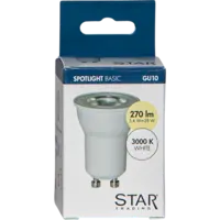 Spotlight med LED. Sockeln är GU10 och spridningsvinkeln är 36°. Ljusskenet är varmvitt.